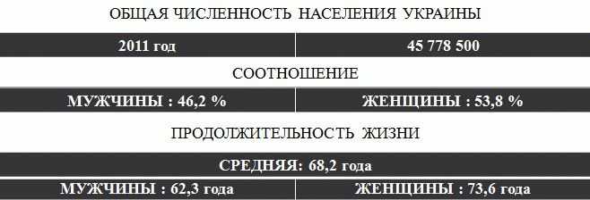 До настоящего времени Украина ежегодно теряет в среднем 330 тысяч человек. Так за 20 лет от 52-х миллионного населения Украины в 2011 году официально осталось 45 778 500 человек.