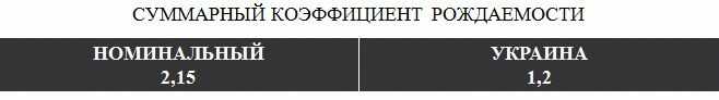 В этой истории логичным казалось бы что вымирает плохо обеспеченное пожилое население страны, но как бы не так. В основном Украина теряет трудоспособное население в возрасте от 30-ти до 50-ти лет. Ситуация усугубляется низким суммарным коэффициентом рождаемости, который выражается в том, что каждая украинская женщина рожает по 1,2 ребёнка, в то время как для воспроизводства [не говоря уже о росте] населения любой страны необходимый коэффициент рождаемости на одну женщину должен составлять 2,15.